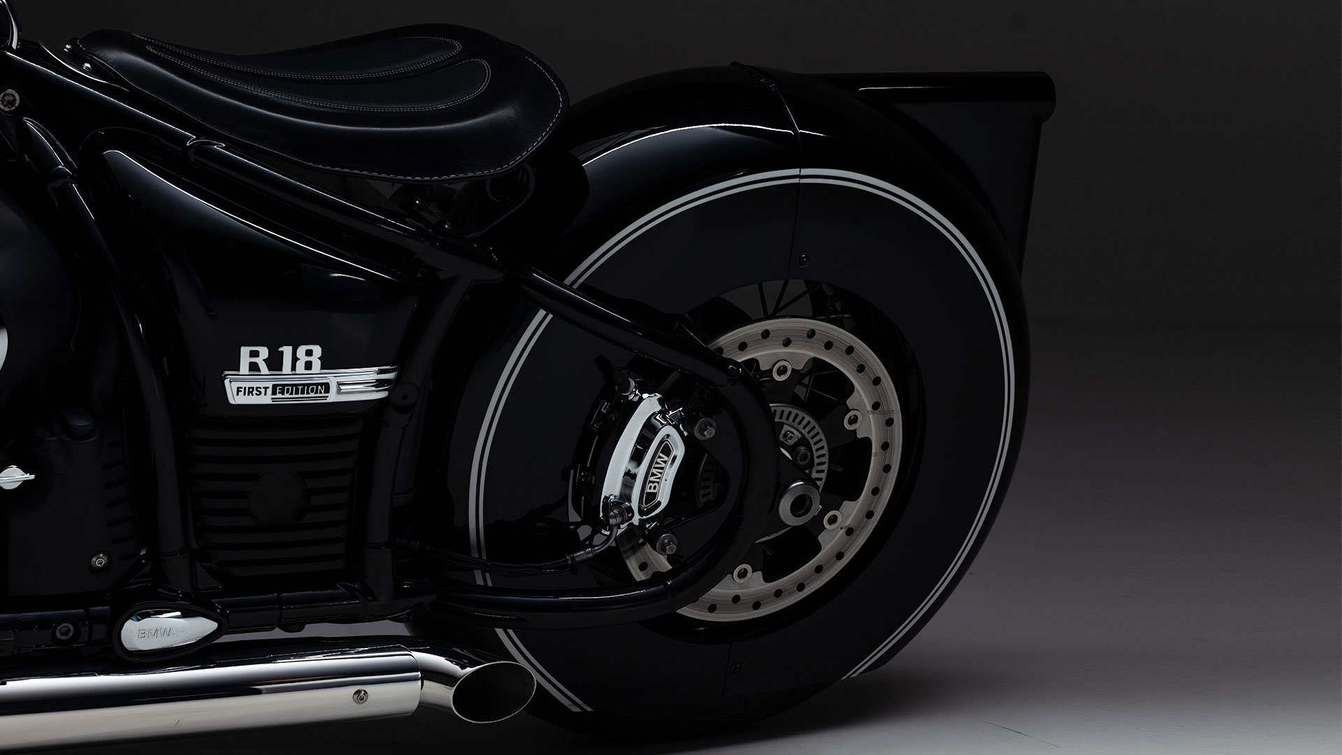 The trim panel fits around the fuel tank with a gap of just 8 mm. Its traditional color scheme featuring the iconic double lines continues virtually seamlessly on the impressive, hand-built component. The paintwork also decorates the rear-wheel cover, which covers an incredible 310 degrees and perfectly extends the front-end design. A hinge mechanism makes it possible to change the wheel on this bike. Precisely positioned openings give a view of the disc brake and drive system. It also becomes obvious here what makes the soul of the Spirit of Passion: it approaches the design of the R 18 with utmost respect while simultaneously becoming a true masterpiece itself.
